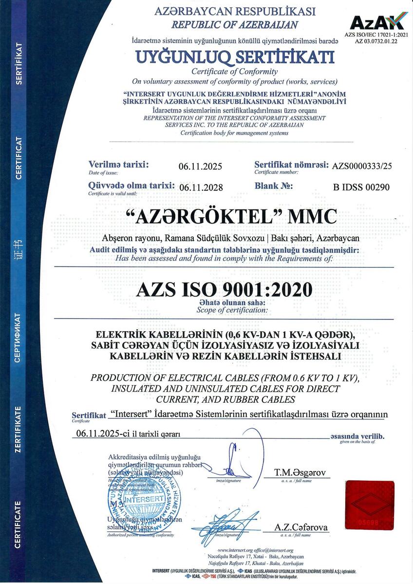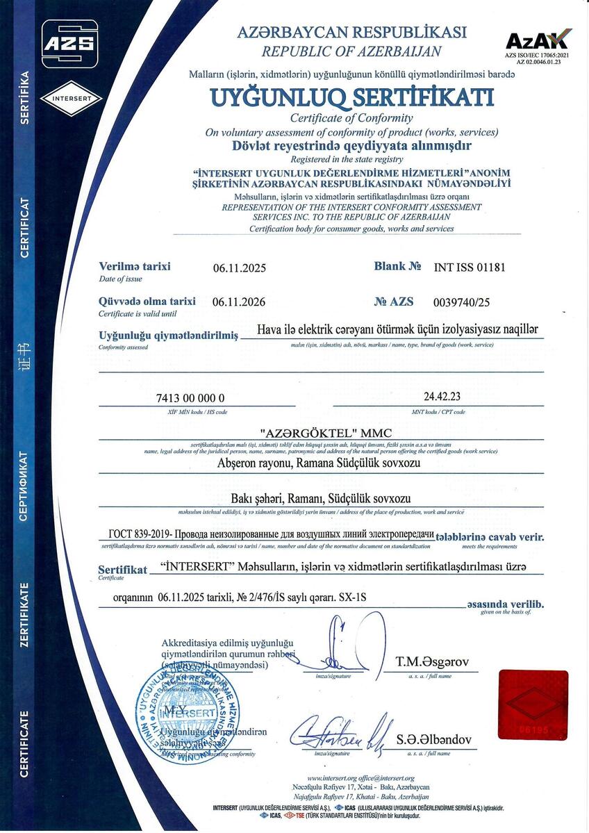 - AZS Uyğunluq Sertifikatı – Azərbaycan Respublikasının Standartlaşdırma İnstitutu (Azstand) tərəfindən verilən milli sertifikat. Bu, ölkədə satış və istifadə üçün məcburi olan sənəddir və məhsulun texniki qaydalara uyğunluğunu təsdiqləyir.